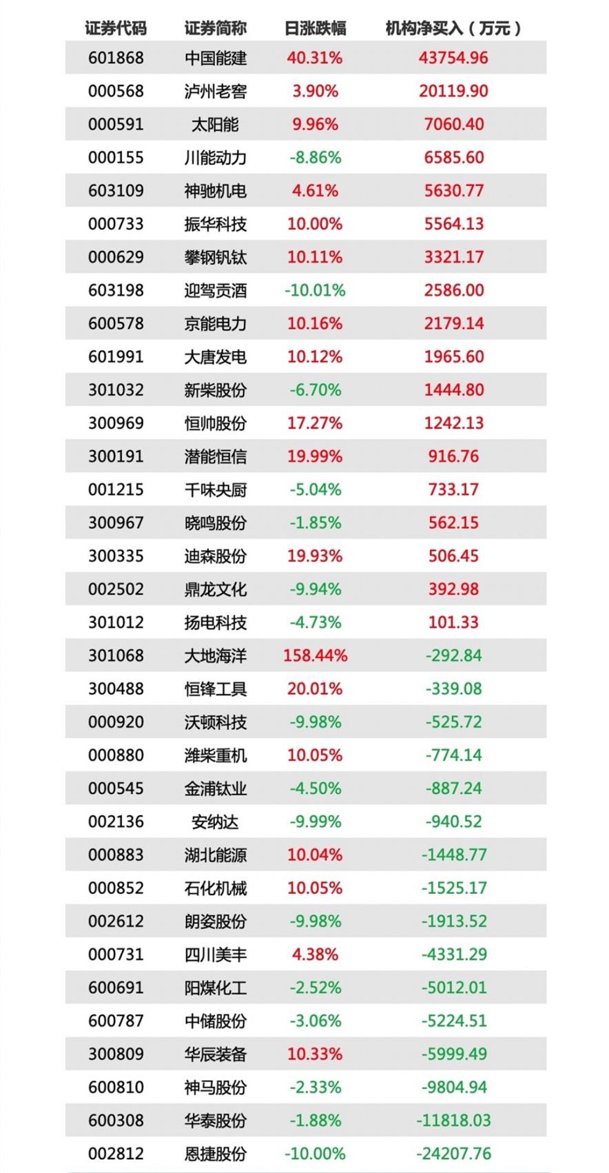 9月28日龙虎榜中,有18只股票呈现机构净买入,16只个股呈现机构净卖出。净买入前三的股票分别是中国能建、泸州老窖、太阳能,净卖出前三的股票分别是恩捷股份、华泰股份、神马股份。