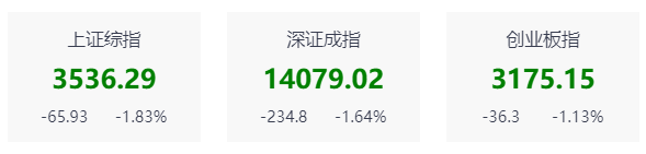 9月29日,A股三大指数低开低走,上证指数(000001.SH)、深证成指(399001.SZ)一度跌超2%,创业板指(399006.SZ)跌超1%,市场情绪较为低迷,两市成交额连续第49个交易日突破1万亿元。截至收盘,沪指跌1.83%,报3536.29点;深成指跌1.64%,报14079.02点;创业板指跌1.13%,报3175.15点。