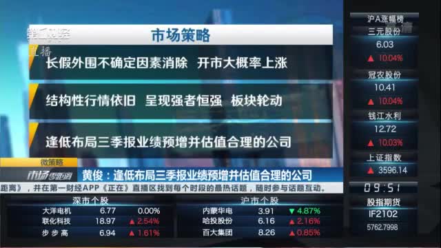 黄俊认为长假外围不确定因素消除,开市大概率上涨,结构性行情依旧,呈现强者恒强,板块轮动。逢低布局三季报业绩预增并估值合理的公司。