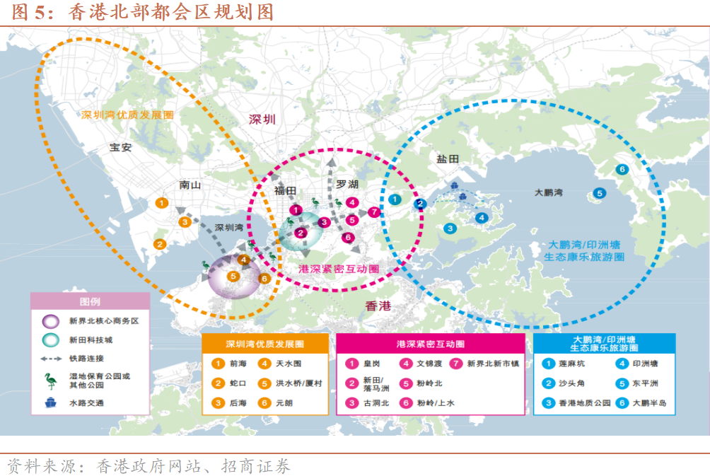 作为“一国两制”框架下首份由香港政府编制,在空间概念和策略思维上大幅跨越深港两地行政界线的行动纲领,《北部都会区发展策略》为香港长远发展制定了新方略。根据该方案,香港将在现有“两湾一河”的地理形态基础上,着力打造“双城三圈”空间格局(“三圈”由西向东分别为深圳湾优质发展圈、港深紧密互动圈和大鹏湾/印洲塘生态康乐旅游圈)。“双城三圈”空间格局的确立,将引导香港各项经济要素向北部地区汇集,发展北部都会区为国际创新科技中心,形成媲美维港都会区的香港经济第二增长极。