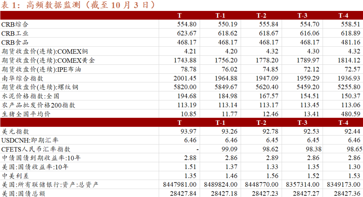 商品价格波动:本周CRB指数上行,10月1日CRB综合指数收盘556.2,较上周同期上行5.4,CRB工业收盘623.4,较上周上行3.0,CRB食品收盘471.3,较上周上行7.7。南华综合指数9月30日收盘2022.3,较前一周同期上行51.2。农产品批发价格200指数收盘113.4,较上周同期上行0.2。生猪全国平均价9月30日收盘10.6元/公斤,较上周下跌7.7%。本周,COMEX铜期货收盘均值4.2,较上周上涨0.4%;COMEX黄金期货本周收盘均值1743.9,较上周下跌0.7%;IPE布油收盘均值78.8,较上周上涨3.6%;螺纹钢期货收盘均值5820.0,较上周下跌0.5%。水泥价格指数9月30日收盘199.2,较上周同期上行14.1。