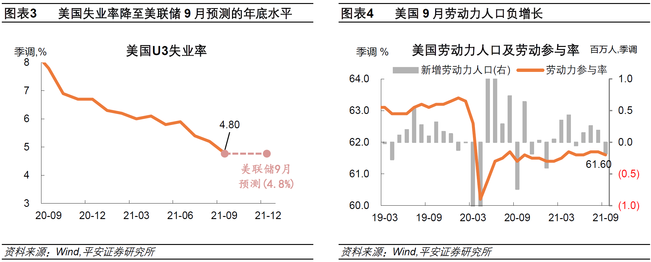美国9月失业率超预期下降,已经达到美联储最新预测的年底水平。9月U3失业率由5.2%下降至4.8%,市场预期降至5.1%,美联储9月最新预测今年年底美国失业率为4.8%(图表3)。美国9月劳动参与率小幅下降0.1个百分点至61.6%(图表4)。虽然劳动参与率下降本身是一个消极信号,但失业人数的降幅更大,带动失业率明显下降。具体来看,9月美国失业人数大幅减少了71万人,至767.4万人(失业率分子),而劳动力人口小幅减少18.3万人,至16135.4万人(失业率分母)。我们认为,美国失业率下降的积极意义,足以抵消劳动参与率下降的消极意义。而美国失业人数减少的原因包括:9月美国各州全面停止发放额外失业金补贴,以及新冠疫情对服务业就业的影响边际减弱,符合我们前期“美国就业复苏后置”的判断。