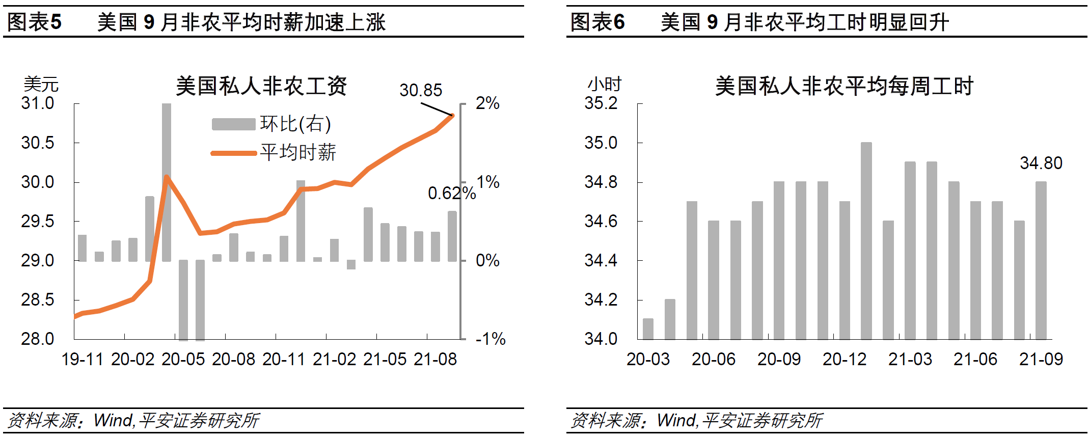 美国9月非农工资增速加快、工时明显回升。9月非农平均时薪涨至30.85美元,环比上升0.62%,为今年4月以来的最高增速(图表5)。9月非农平均每周工时升至34.8小时,亦为今年4月以来最高水平(图表6)。我们认为,工资上涨与工时增加,继续反映出美国就业市场需求旺盛,用工需求将最终通过刺激工资上涨、迫使企业增加员工福利等渠道转化为就业人数的修复。