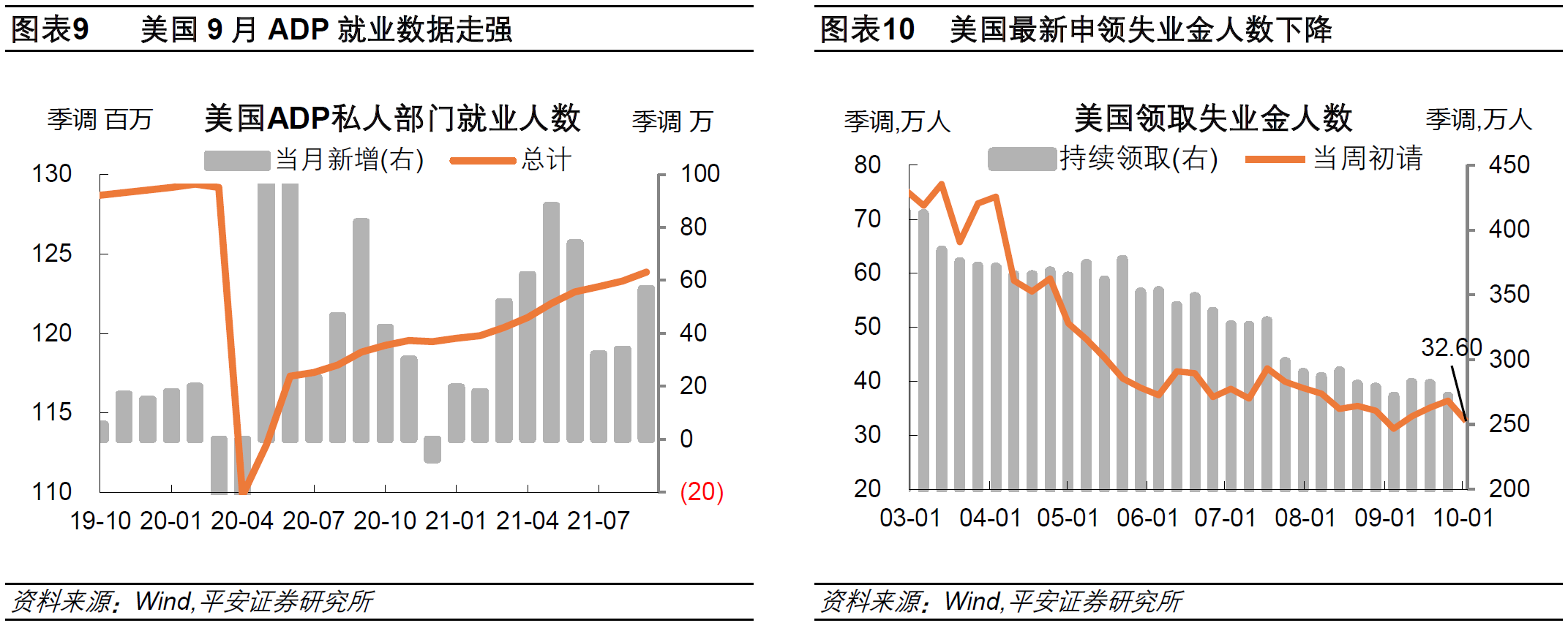 第一,鲍威尔9月议息会议后强调,美联储更看重非农就业恢复的累积进展(accumulated progress)而不是单月数据。目前,美国非农就业总人数相比最低点已经恢复近8成,虽然9月新增非农有限,但仍保持正增长,且其中部分服务业就业情况正在改善。因此,美联储仍有理由“说服”市场,非农数据即将实现Taper所需的“进一步实质性进展”。