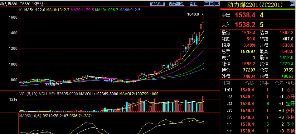 期货盘面上,动力煤期货主力合约昨日夜盘一度大涨10%再创历史新高。今日早盘涨幅回落,截至发稿报1538.4元每吨,涨3.4%。