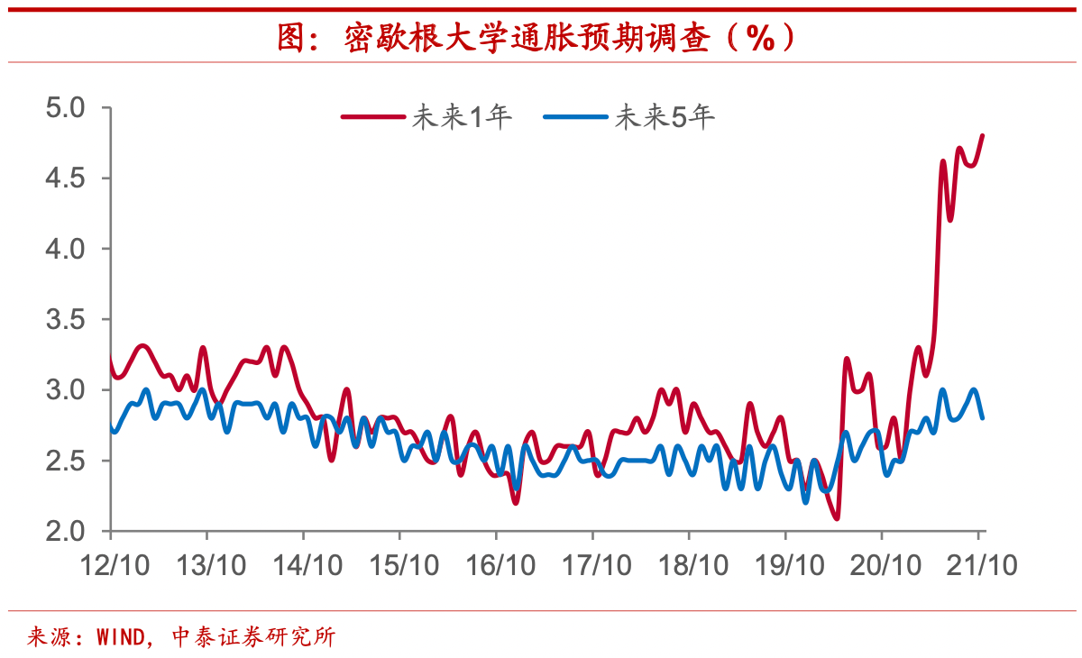 美国10月密歇根大学通胀预期调查显示,消费者预计未来一年的通胀率为4.8%,创2008年来新高,相较9月4.6%上升0.2%,而消费者预计未来五年通胀率较9月3%下滑至2.8%。美联储9月议息会议预测本年PCE同比为4.2%,2022年PCE同比下降至2.2%。这意味着当前美国通胀已处于较高水平,美债收益率对于通胀预期的反映也较为充分。因而,不考虑市场情绪带来的超调,我们预计,美国经济增长将较快步入稳态,美债利率上升的幅度并不会太高,年内突破2%的概率较低。
