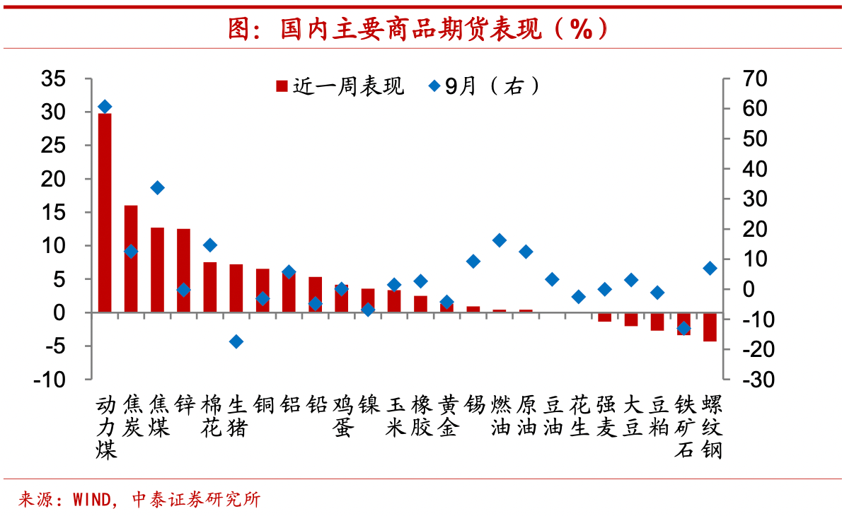 国内商品期货方面,动力煤领涨。本周国内商品期货方面,动力煤领涨,大涨30%,焦炭、焦煤分别上涨16%、12.7%。铁矿石、螺纹钢回落,分别下跌3.4%、4.3%。