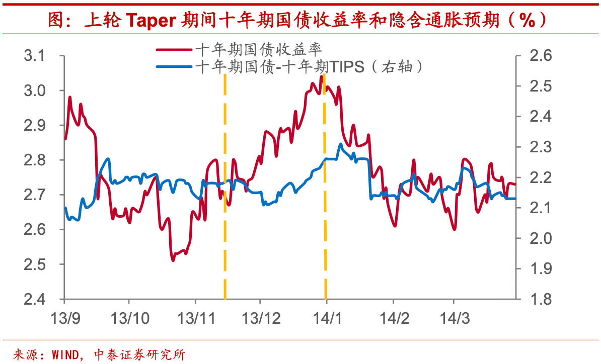 美联储在2013年12月宣布缩债,2014年1月正式实施,结合目前的情况,我们预计本轮缩债将在今年11月中旬实施。因此,我们将目前时间点锚定2013年11月中旬。观察缩债期间美债收益率变动,我们发现,从宣布缩债计划开始,美债收益率便逐步提升,至13年底相较11月中旬上升约0.3%,其中实际利率上升的贡献约为82%,在此之后收益率与实际利率均有所回落。在美联储和市场沟通已较充分的情况下,此次情形与上轮Taper也颇为类似。
