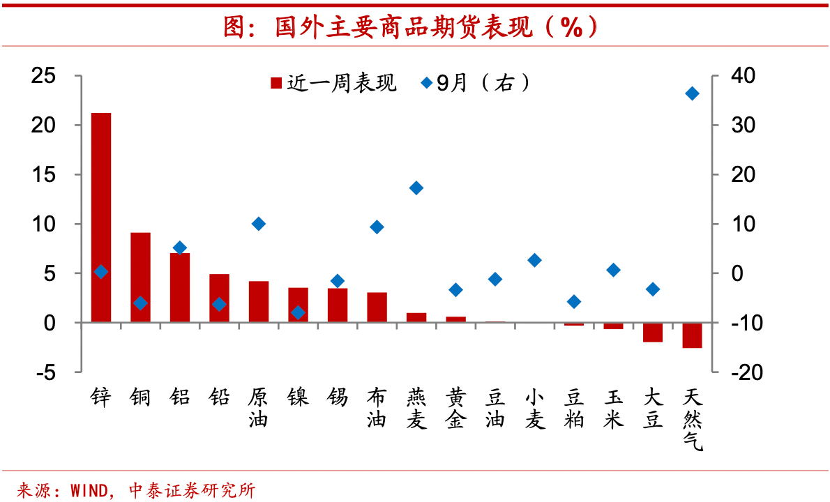 国外商品期货方面,有色领涨。本周国外商品期货方面,有色金属领涨,其中锌暴涨21.2%,创下单周最大涨幅,铜、铝涨幅紧随其后。大豆、天然气回落,分别下跌2%、2.6%。