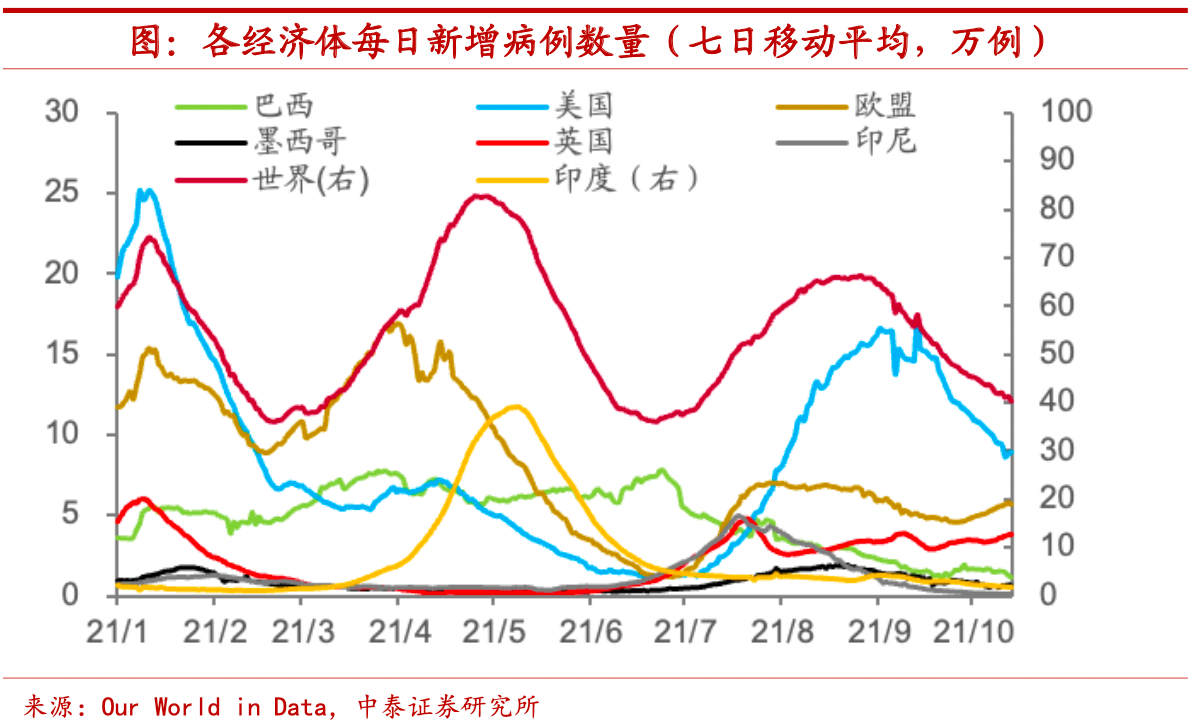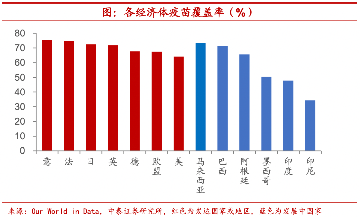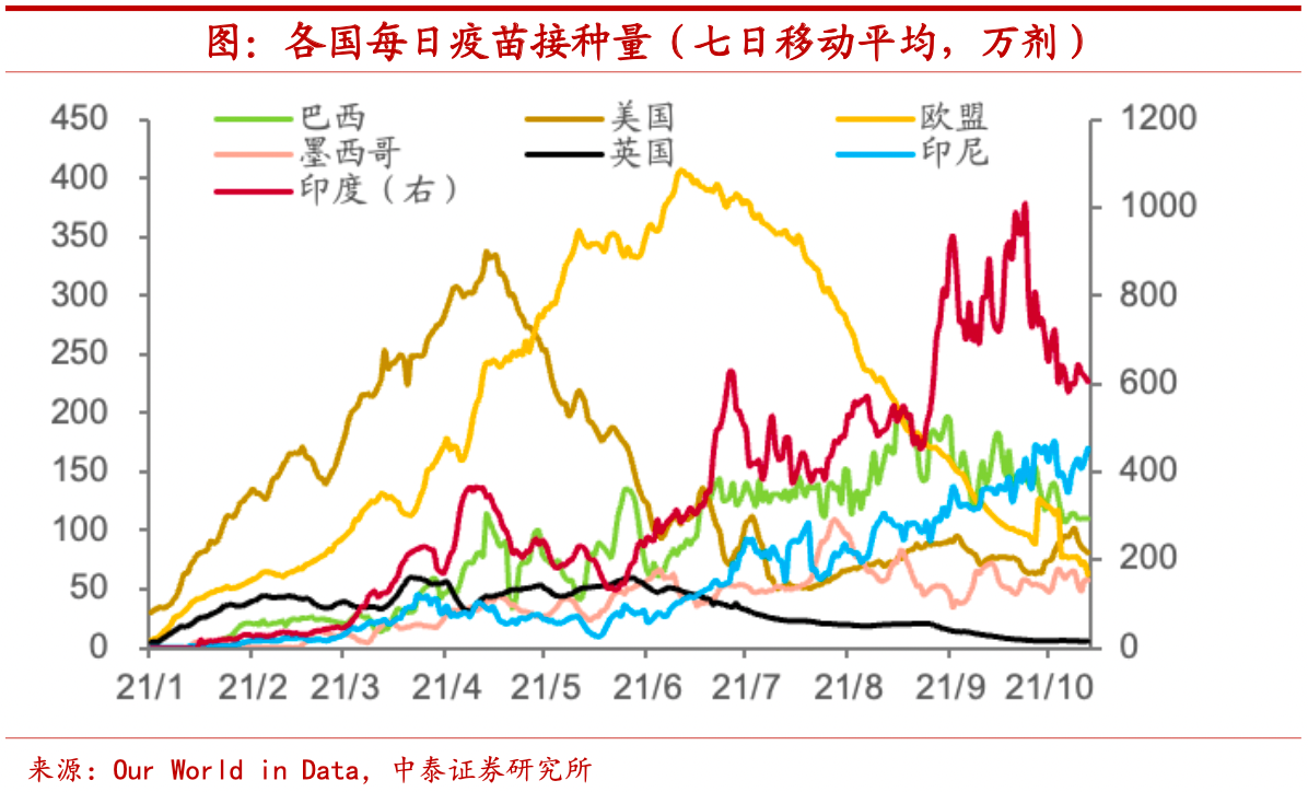 低收入国家疫苗接种比例仍位于低位。根据Our world in data的最新数据,全球已注射了66亿剂疫苗,48%的世界人口至少接种了一剂COVID-19疫苗,低收入国家中只有2.5%的人注射了至少一剂。发达国家疫苗覆盖率放缓,英、法、意、德上升趋势平稳。巴西、马来西亚、日本的疫苗接种率均超过72%,高于美国的65%,但印度和印尼的疫苗覆盖率仍然很低,未超过50%。
