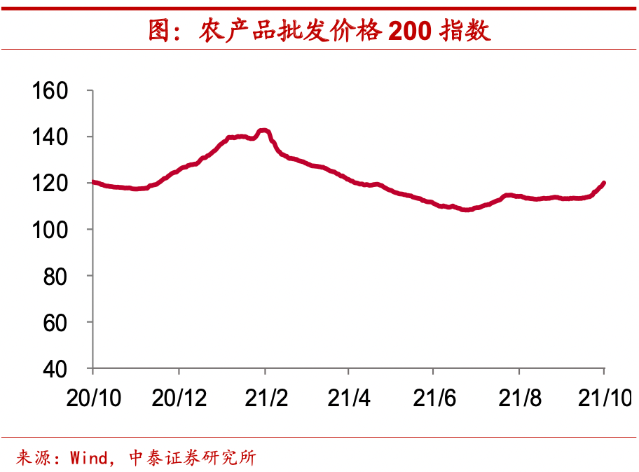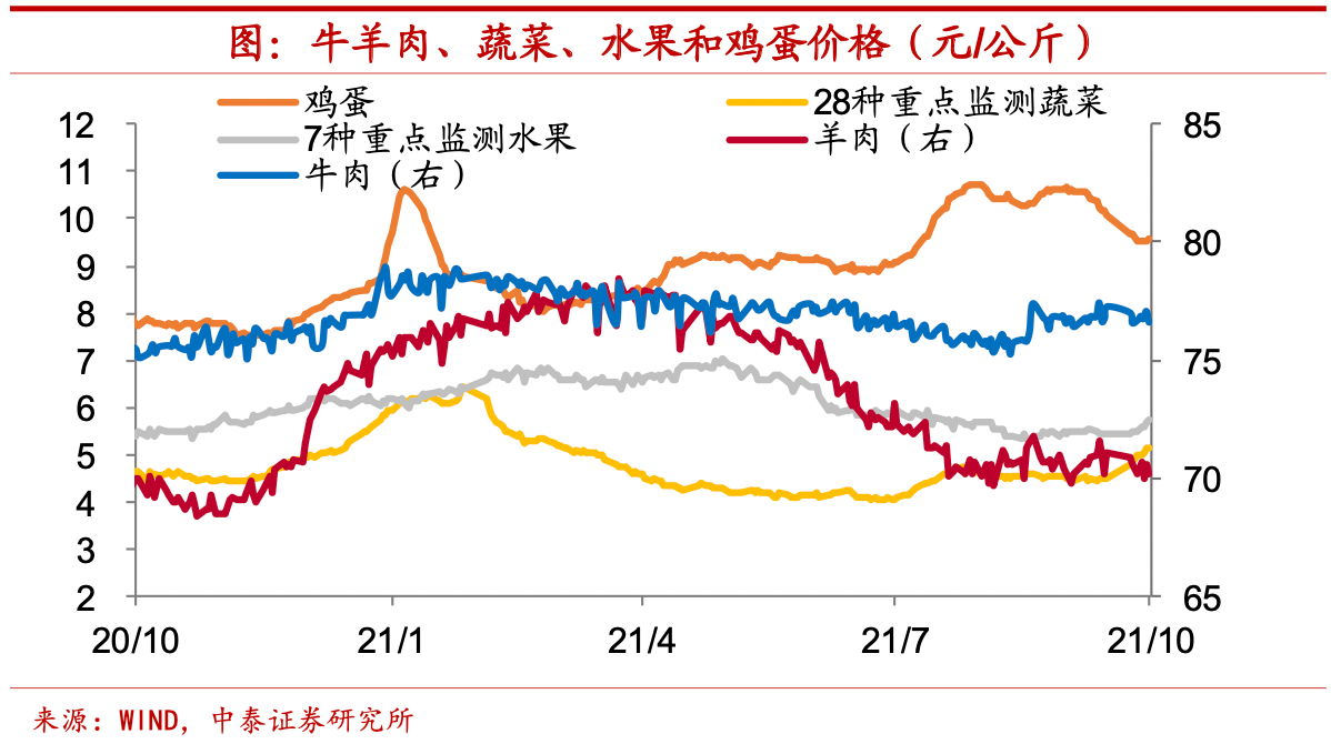本周28种重点监测蔬菜、7种重点监测水果价格均值环比上行,分别上升4.8%和2.6%;羊肉、鸡蛋均值环比分别下滑0.3%和1.3%;10月牛肉、蔬菜、水果平均价格上行,羊肉和鸡蛋价格下行。