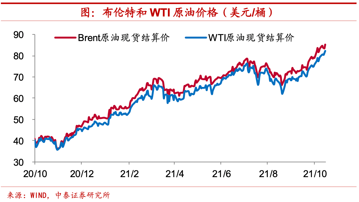 国际油价持续上涨。本周布伦特原油价格和WTI原油价格均值环比上升,升幅分别是1.9%和3.5%。10月国际油价走高,布伦特原油价格和WTI原油价格均持续上涨,均价较上月分别增加10.9%和11.1%。