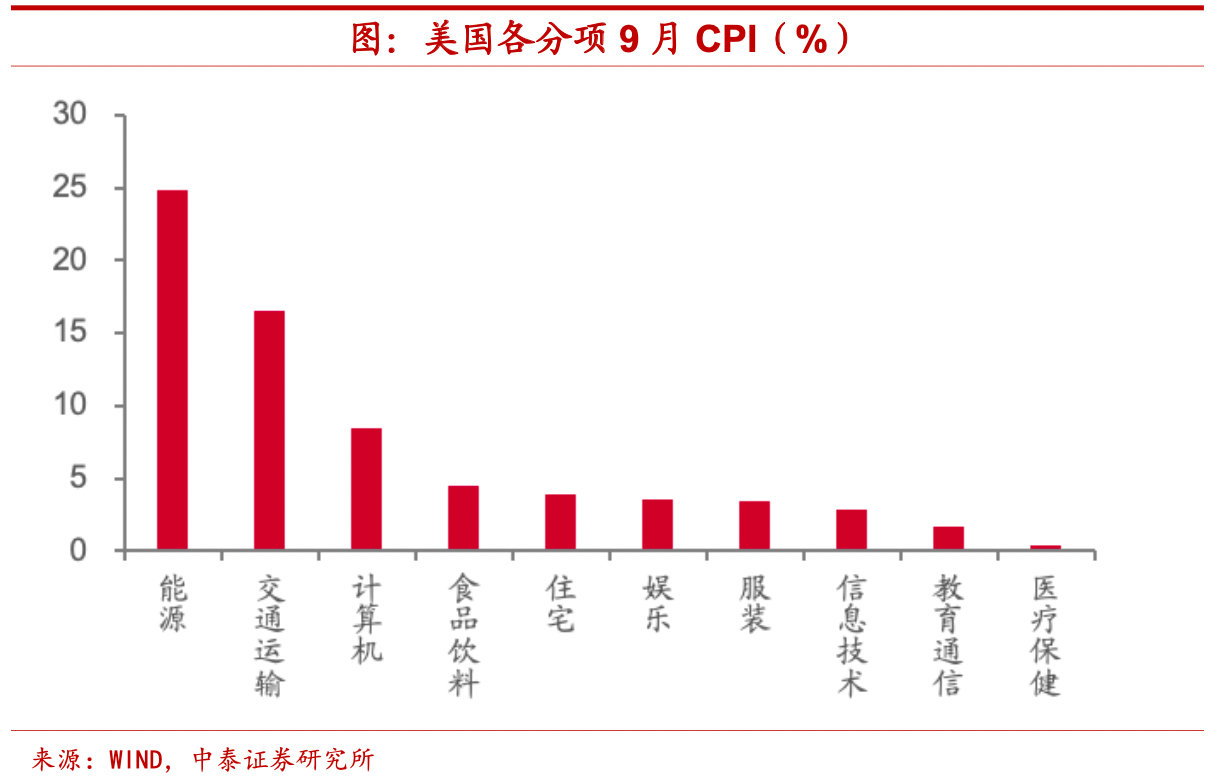 美国9月CPI同比增速上涨。美国9月CPI同比升5.4%,创1991年1月以来的最高水平,前值升5.3%。从具体分项来看,能源、交通运输、计算机等同比增速较高,分别为24.8%、16.5%以及8.5%。9月CPI环比升0.4%,前值升0.3%,计算机、食品、信息技术等环比增速较高分别为1.2%,0.9%,0.7%,前值分别为0.1%,0.4%以及0.8%。