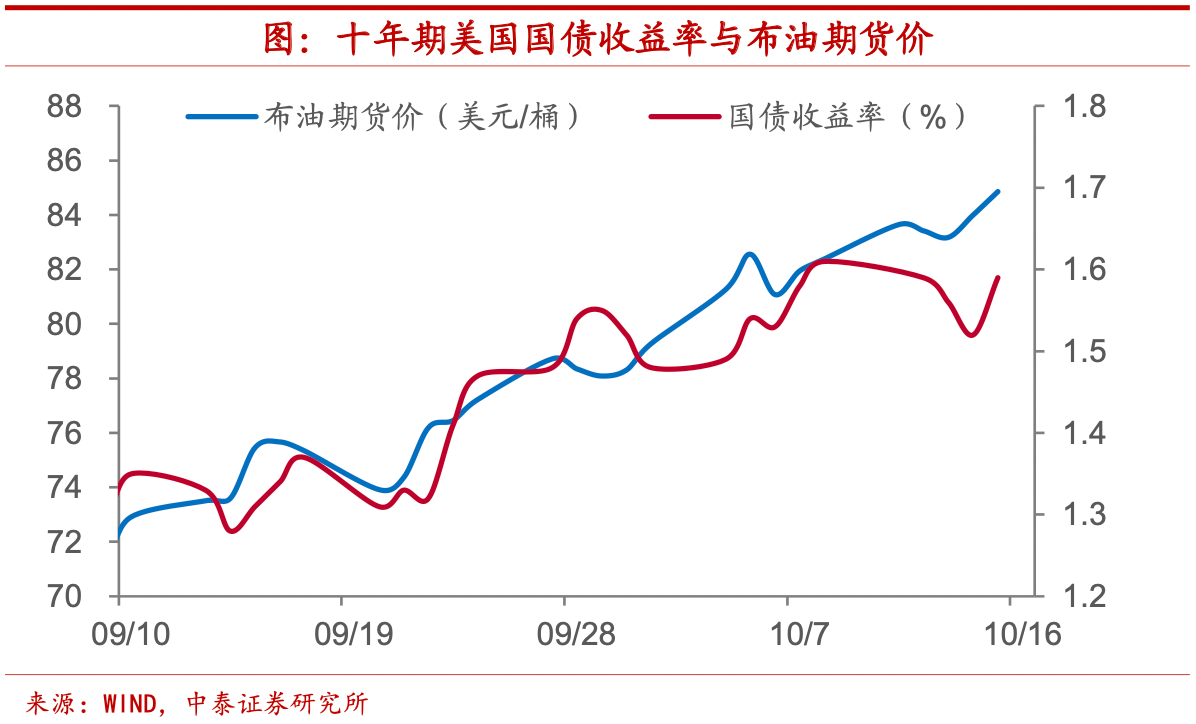 从基本面的角度来看,通胀预期变化也是助推美债收益率上行的重要因素。近期,薪资水平和能源价格持续上升使市场对通胀上行心存担忧。美国9月平均时薪环比增速继续上升,从0.4%上升到0.6%,同比增速高位上行。能源方面,由于供需缺口持续存在,石油和天然气价格持续上涨,EIA认为美国过冬能源需求将上升20%,能源产品价格或将维持高位,EIA对WTI和布油的明年价格预期均上调近6美元
