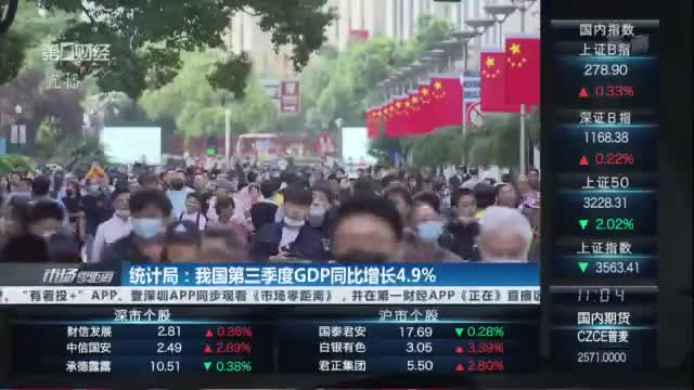 今天上午,国家统计局数据显示,初步核算,前三季度国内生产总值82万3131亿元,按可比价格计算,同比增长9.8%,两年平均增长5.2%,比上半年两年平均增速回落0.1个百分点。分季度看,一季度同比增长18.3%,两年平均增长5.0%;二季度同比增长7.9%,两年平均增长5.5%;三季度同比增长4.9%,两年平均增长4.9%。分产业看,前三季度第一产业增加值5万1430亿元,同比增长7.4%,两年平均增长4.8%;第二产业增加值32万0940亿元,同比增长10.6%,两年平均增长5.7%;第三产业增加值45万0761亿元,同比增长9.5%,两年平均增长4.9%。从环比看,三季度国内生产总值增长0.2%。