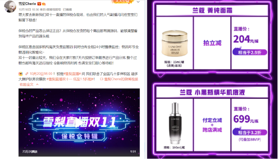 除了薇娅李佳琦,另一位头部主播雪梨也加入了美妆护肤品类的battle,打出了保税区正品溯源的卖点。从预售清单来看,薇娅、李佳琦的直播间促销形式仍然以赠品为主,雪梨除了搭配赠品之外还会以“拍立减”的形式进行营销,契合了目前一部分消费者“单人套餐”的需求。