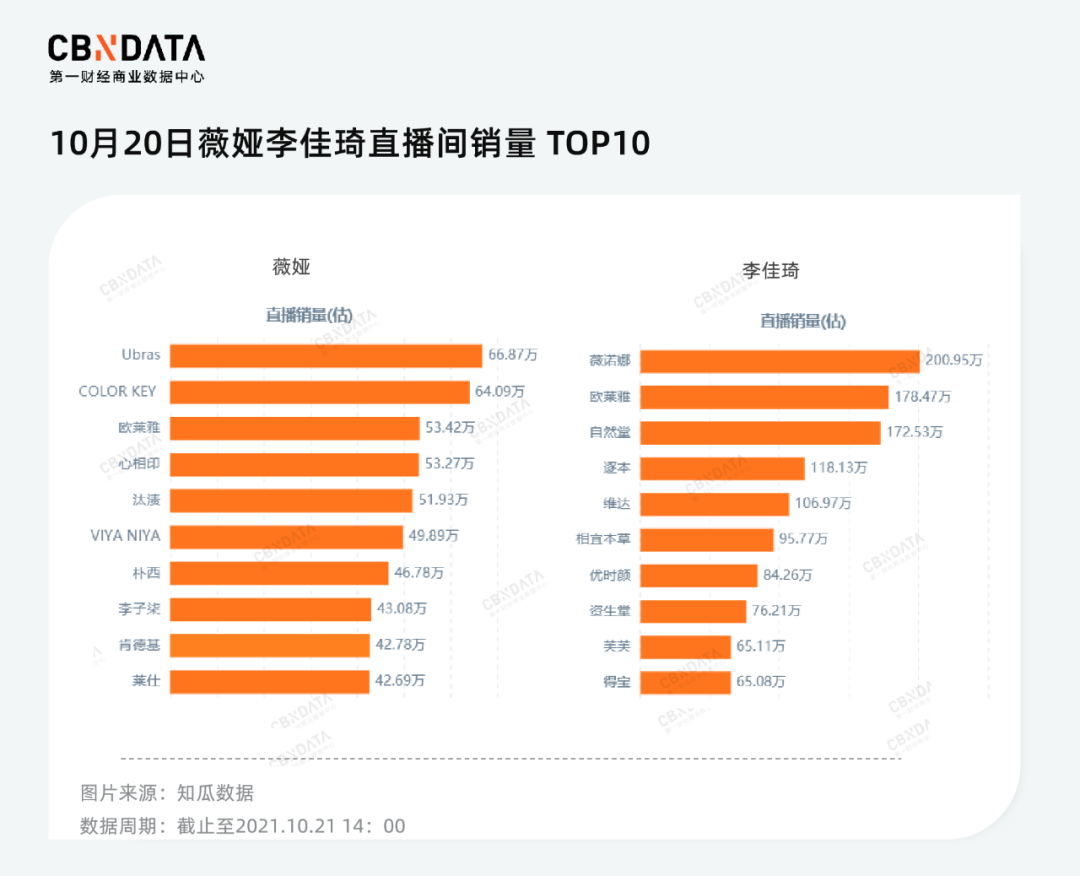 这场万众瞩目的直播,薇娅、李佳琦均斩获超过2.3亿的累积观看量,创造了新的历史记录。知瓜数据显示,截至21日下午13:30分,两个直播间销售额均超100亿,累计相加超过200亿,比去年令人咋舌的累计70亿翻了近两番,战绩不可谓不惊人。