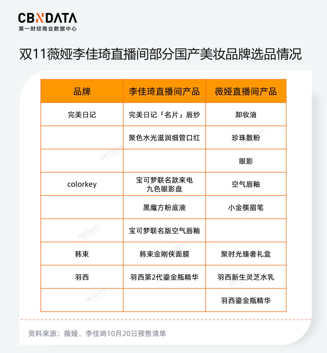 与去年相比,双11两大直播间的国际品牌与国货品牌占比并未出现较大改变,但在国际大牌的猛烈炮火下,国货之光们似乎更努力了。去年,几乎所有国产美妆品牌都采取二选一的策略,今年完美日记、colorkey、韩束、羽西四个国产品牌则分别以不同产品同时占据头部主播的坑位。完美日记在薇娅直播间推眼影、卸妆油,在李佳琦直播间则主打唇部产品;colorkey的丝绒唇釉和小金筷眉笔瞄准薇娅,眼影和粉底液则交给李佳琦。
