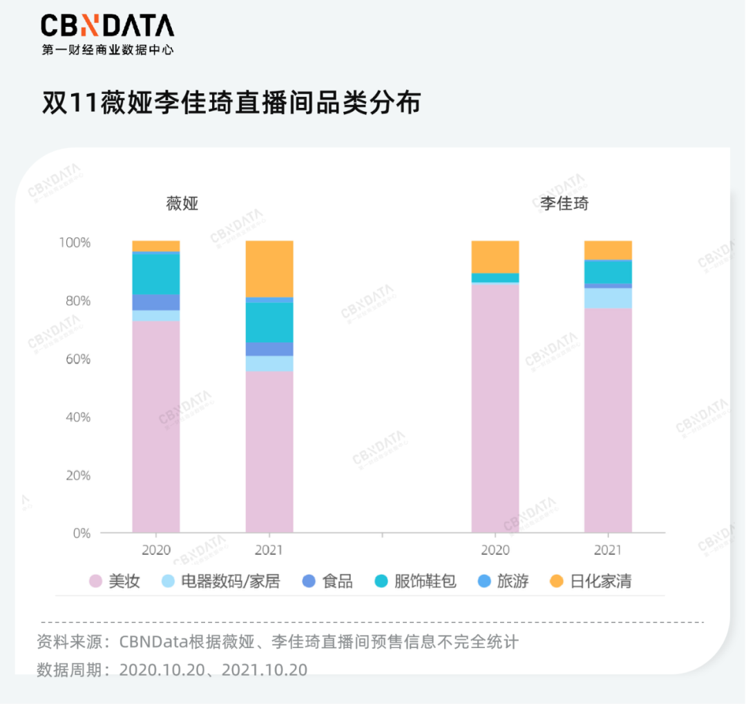 美妆护肤仍然是两大直播间的重头戏,但整体SKU的增加也降低了美妆护肤品类的含量,相较去年,薇娅李佳琦该品类的比例均有下降,前者的日化家清品类上涨了15%左右。
