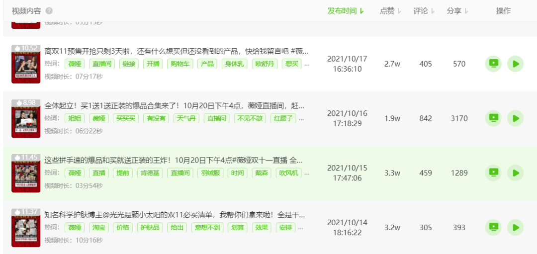 薇娅的双11预热采用了发布“Top榜单”和短视频的方式。从10月初开始,除了以图文的形式进行商品剧透,薇娅直播间还会在每天直播开始之前以商品讲解、科普课堂的短视频形式剧透5~6个折扣单品。CBNData消费站(下称C站)发现,这些短视频也会在薇娅官方的抖音号、微博账号以及B站上同步分发。飞瓜数据显示,薇娅近期的剧透短视频均能斩获2~3万的点赞。