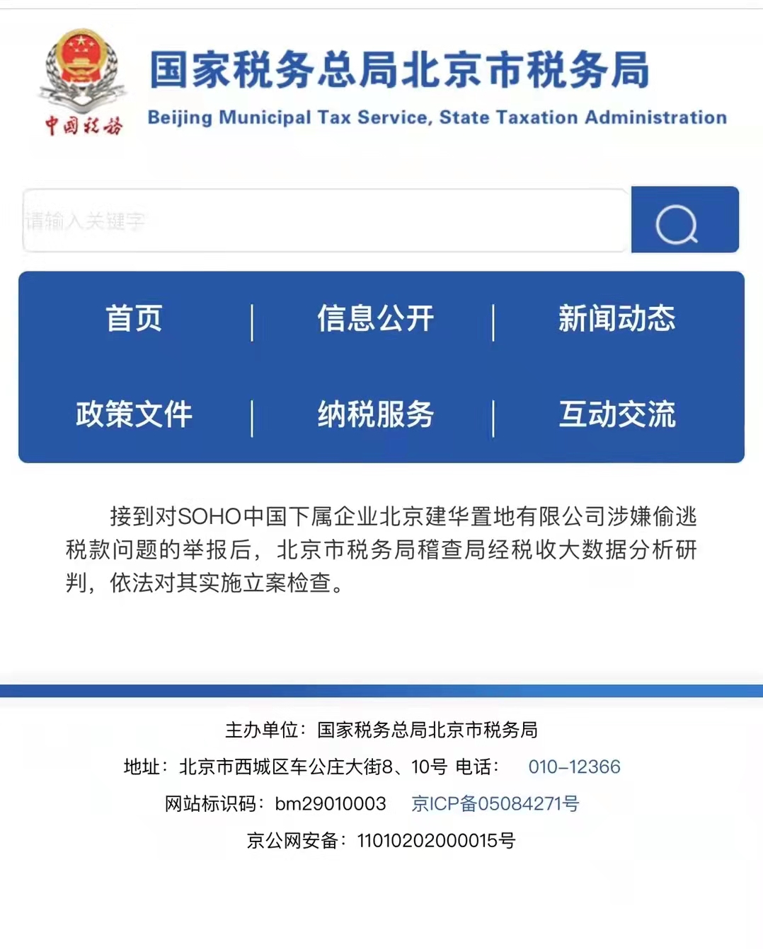 据北京市税务局消息,接到对SOHO中国下属企业北京建华置地有限公司涉嫌偷逃税款问题的举报后,北京市税务局稽查局经税收大数据分析研判,依法对其实施立案检查。