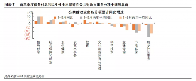公共财政支出也未向基建领域倾斜。前三季度,债务付息支出同比4.2%,两年平均增速虽从10.5%小幅下滑到10.3%,但在公共财政各主要支出分项中仍是最高的;用于社保就业、卫生健康和教育等基本民生领域的公共财政支出两年平均同比分别为5.3%、3.1%和1.6%,较前8个月的降幅都超过1个百分点;公共财政投向与基建有关的农林水事务、交通运输、节能环保和城乡社区事务的总支出两年平均增速,从前8个月的-7.6%下滑到-8.2%,降幅和公共财政支出的基本持平(图表7)。