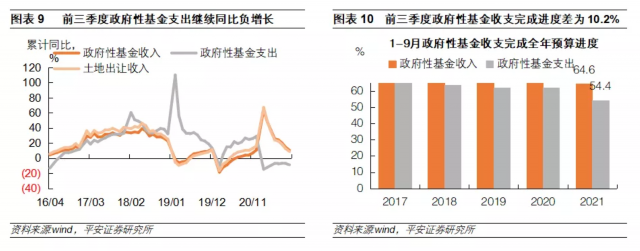 地方专项债发行加快后,政府性基金支出也有所提速。前三季度政府性基金收入同比10.5%,两年平均增速为7.1%,均较前值14.2%、8.1%回落,国有土地出让收入增速放缓是其主因(图表9)。