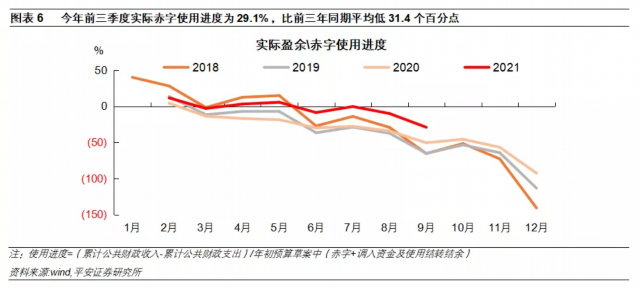 财政赤字使用率有所提高。今年前三季度公共财政收入预算完成进度为83.0%,比2018-2020年的同期均值高4.3个百分点(图表5)。若今年前三季度公共财政收入占全年比例与前三年同期的均值相同,可估算得全年一般公共预算将超收5.4%。前三季度公共财政支出完成进度为71.7%,略高于去年同期的70.7%,但要明显低于2018年(77.8%)和2019年(75.9%)。前三季度公共财政收支完成进度差为11.3%,低于前8个月的13.8%。9月单月的公共财政赤字为9990亿,低于前三年9月的均值1.09万亿,也能印证9月财政支出并未明显发力。前三季度累计公共财政赤字1.53万亿,赤字使用率为29.1%,较前8个月的10.1%有所提高,但提高速度慢于季节性,累计财政赤字使用率也要比前三年同期的均值低31.4个百分点(图表6)。