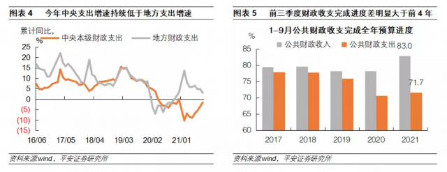 9月财政支出节奏放慢。前三季度公共财政支出同比2.3%,较前值3.6%明显回落,两年平均同比也从0.7%降低到0.2%。公共财政支出当月同比从上月的6.2%大幅下滑到-5.3%,两年平均增速也从7.5%下降到-3.2%。财政支出的单月两年平均同比,8月年内首次高于收入增速,9月又再度低于财政收入的增速,“后置”的财政仍未现明显发力迹象。分中央和地方两级政府看,前三季度中央一般公共预算本级支出同比下降1.6%,两年平均同比下降1.9%,体现了中央严格落实过紧日子的要求;地方一般公共预算支出同比增长3.0%,两年平均同比从1.5%下滑到0.5%,地方财政支出节奏仍较慢(图表4)。