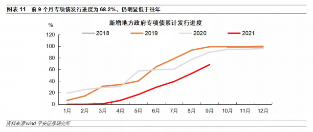 总的来说,9月政府性基金支出继续加快,地方专项债发行提速是主要原因。今年前三季度新增专项债发行进度为68.2%,明显低于往年,四季度还可发行1.1万亿。根据财政部领导介绍,要争取在11月底前发行完毕。考虑到新增专项债集中发行,以及土地招拍挂到缴纳土地出让金之间存在时滞,我们认为今年四季度政府性基金支出将继续较快发力。
