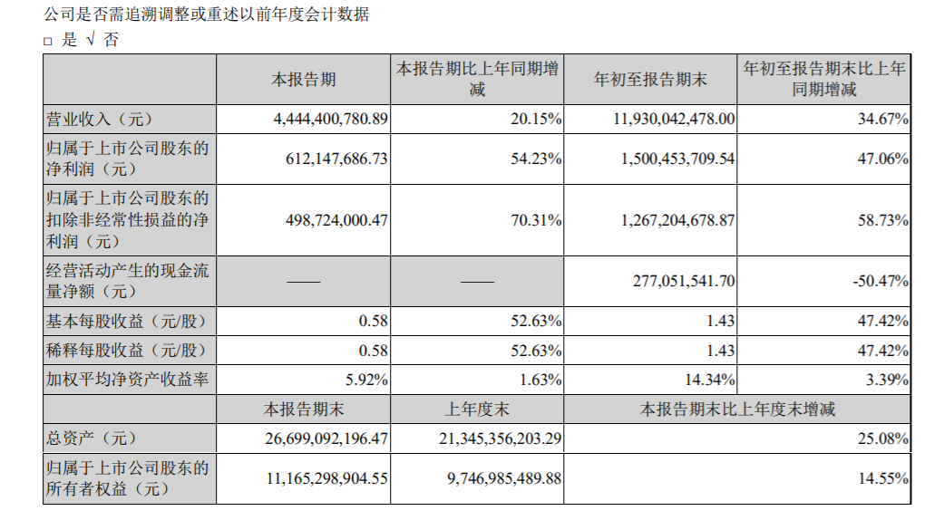 10月25日,大族激光披露三季报,公司2021年第三季度实现营业收入44.44亿元,同比增长20.15%;净利润6.12亿元,同比增长54.23%。