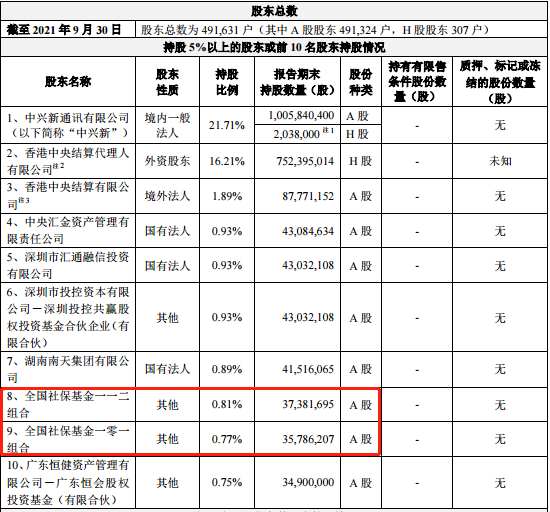 此外,从股东信息方面看,截至2021年9月30日,中兴通讯股东总数为49.16万人。其中中兴新通讯有限公司持股比例21.7%,为最大股东。香港中央结算代理人有限公司持股7.52亿股,为第二大股东,香港中央结算有限公司持股8777万股,为第三大股东。而在年中报时,其持股8378万股,增持400万股。