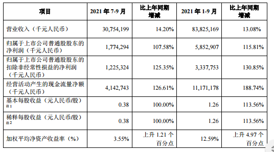 其中,第三季度公司营业收入307.54亿元,同比增长14.20%;净利润17.74亿元,同比增长107.58%。