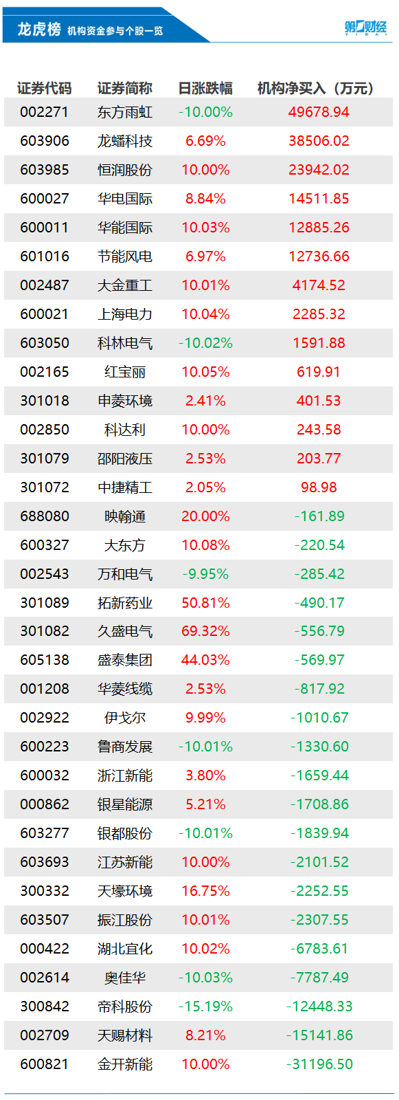 当天机构净买入前三的股票分别是东方雨虹、龙蟠科技、恒润股份,净买入金额分别为4.97亿元、3.85亿元、2.39亿元。