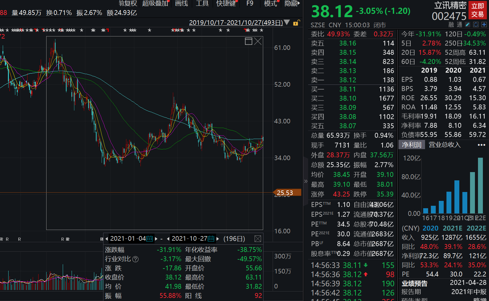 截至今日收盘,立讯精密跌超3%,报38.12元,该股年内累计跌近32%。