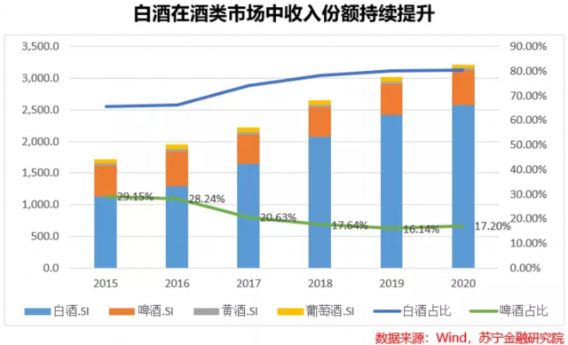 更值得注意的一点是,啤酒在整个酒类市场中收入的份额在2020年有了止跌回升的趋势,这一定程度上能够打开啤酒市场的想象空间。