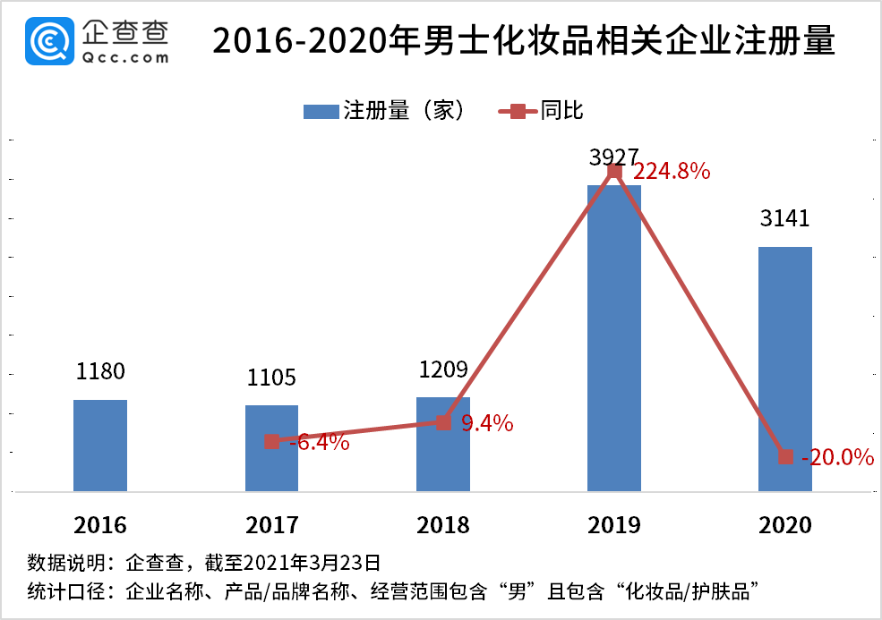 企查查数据显示,2016年男士化妆品/护肤品相关企业新增注册1180家,2017年新增1105家,2018年新增1209家,2019年新增3927家,2020年新增3141家。近两年男士化妆品/护肤品相关企业注册量增速迅猛。