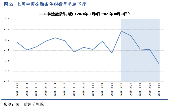 截至2021年10月29日的一周,第一财经研究院中国金融条件日度指数均值为-1.26,与前一周基本持平;指数年内下降0.76。
