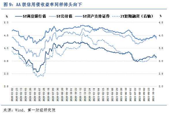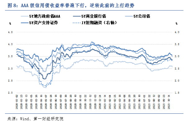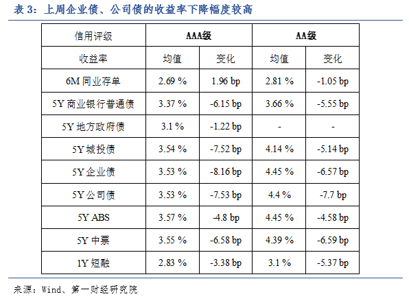 从信用债市场来看,上周信用债各品种收益率普遍下行,其中企业债与公司债收益率的周内下行幅度较为明显,为6-8bp。
