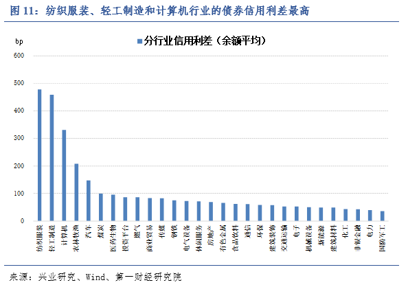 从分行业来看,纺织服装、轻工制造和计算机行业的债券信用利差最高,分别为477bp、358bp及331bp。