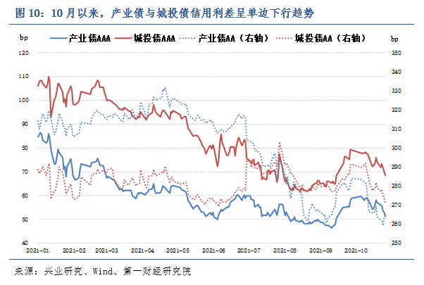 根据兴业研究的数据,10月以来,产业债与城投债的信用利差(余额平均)数据均降幅明显。截至10月29日,AA级产业债信用利差为263.83bp,AA级城投债信用利差为271.02bp。