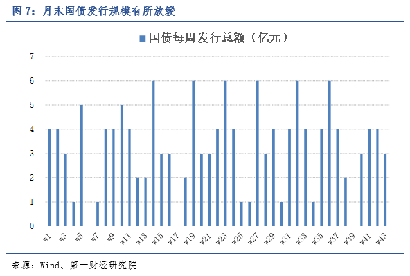 上周,国债收益率曲线基本保持平稳,仅3月期国债收益率的周内均值较前一周升幅显著,达到23.18bp。上周国债发行规模有所回落,由前一周的2044亿元下降至1200亿元。