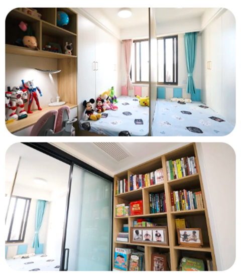 #儿童房划分为相对公平的对称格局,充分利用儿童房前的过道面积,划分出玩耍的区域和储藏区