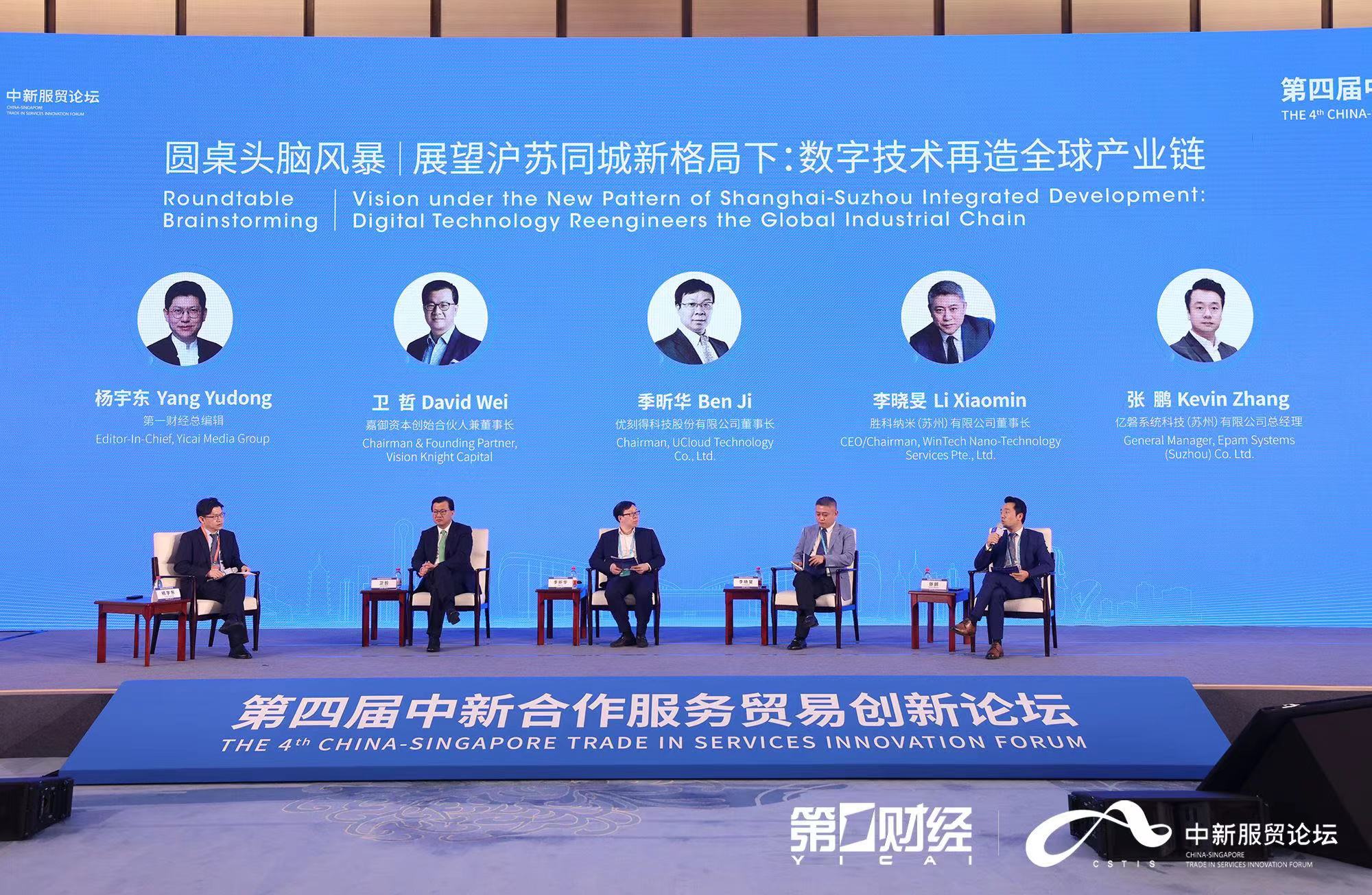 论坛上,第一财经总编辑杨宇东与沪苏两地企业与机构代表一起,就“展望沪苏同城新格局下:数字技术再造全球产业链”展开了一场圆桌头脑风暴。