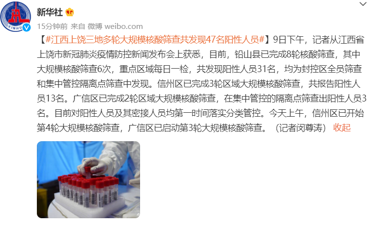 目前对阳性人员及其密接人员均第一时间落实分类管控。今天上午,信州区已开始第4轮大规模核酸筛查,广信区已启动第3轮大规模核酸筛查。