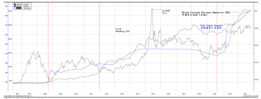 图表2:美联储资产负债表与中国外汇存款以及深证的对比