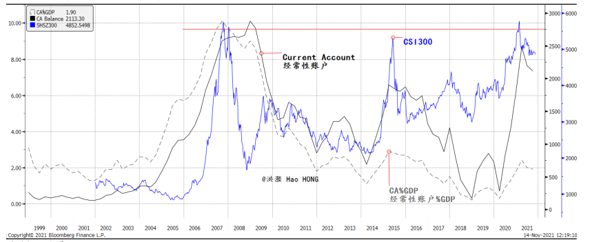为了解答这个谜团,我们将目光投向中国的经常账户盈余,因为其对股票市场的表现举足轻重。从历史上看,股市总是与经常账户盈余齐头并进,相伴触顶。例如,经常账户盈余在2008年年初,2015年年中以及2021年年初均达到顶峰,沪深300指数亦并行见顶。我们相信中国经常账户盈余的变化可以帮助我们解释中国在岸和离岸市场两极分化的表现。