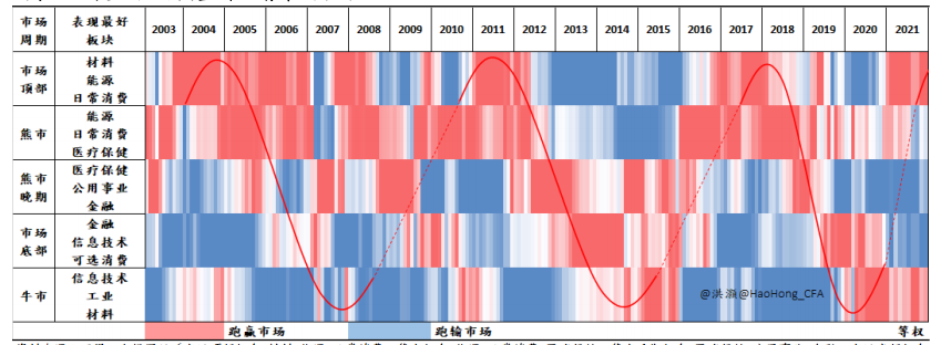 资料来源:万得,交银国际(市场顶部组合=材料+能源+日常消费,熊市组合=能源+日常消费+医疗保健,熊市后期组合=医疗保健+公用事业+金融,市场底部组合 =金融+信息技术+可选消费,牛市组合=信息技术+工业+材料)。