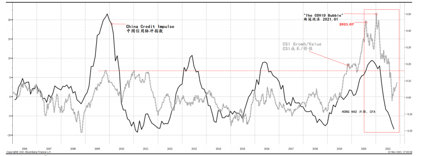 因此,中国的外汇存款对于中国的风险资产价格举足轻重,我们将其称作中国的“影子联储”。随着美联储已花光所有力气、穷尽所有借口而不得不开启缩减购债,中国的出口增速即将放缓,外汇存款的快速增长很可能将暂告段落,从而制约市场的潜在升幅。相反,如果新冠疫情持续肆虐,扰乱供应链,并导致黏性通胀,则美联储将不得不超预期地收紧货币政策。如是,这种场景对于市场的运行无异于雪上加霜——这将是股票和债券的通敌—— 滞胀。