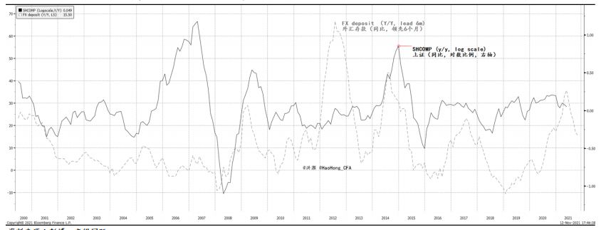 图表4:中国外汇存款增长领先上证回报率6个月